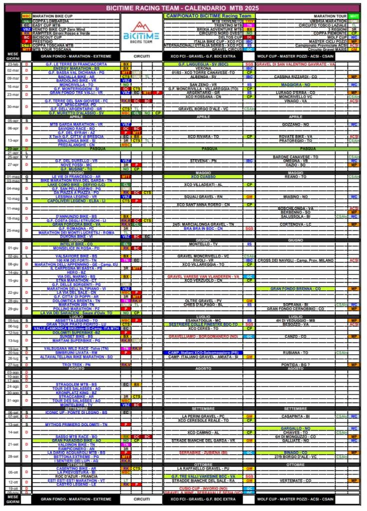 CALENDARI 2025 DEFINITIVI – STAGIONE PARTITA Aggiornato definitivamente il Calendario MTB e Gravel 2025 si comincia a fare sul serio… e c’è chi ha già cominciato! CALENDARIO_MTB’2025_DefinitivoDownload Condividi: Fai clic per condividere su X (Si apre in una nuova finestra) X Fai clic per condividere su Facebook (Si apre in una nuova finestra) Facebook Mi piace Caricamento... 28 febbraio 20251 marzo 2025 by Bicitime.com - Bicitime Racing Team