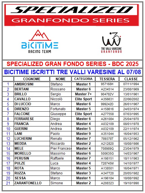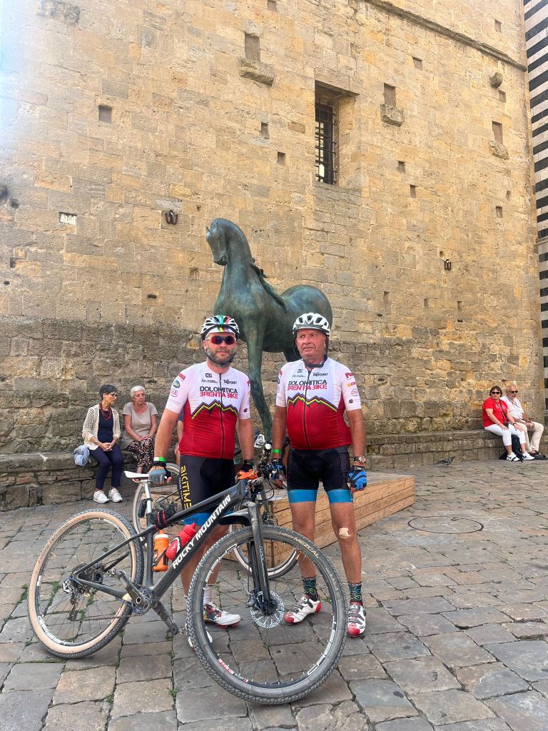 Più tranquilla ma comunque impegnativa la trasferta di Francesco (Airaga) e Sergio (Brillo) che in Toscana (Lajatico – PI) si sono goduti le classiche ed affascinanti strade bianche delle colline Toscane, i ricchi ristori e l’ottima cucina locale. Tornando nel nostro territorio Maryann ha partecipato goliardicamente alla Crono Coppie in ricordo dell’amico Beppe Vuolo che ci ha lasciato un anno fa mentre un gruppetto di “sfortunati” (Andrea, Carlo, Massimo, Renato e Rossano, in cinque contano 3 forature…) hanno provato il percorso lungo dell’imminente Gran Fondo Tre Valli Varesine in BDC (5 ottobre) a cui ad oggi siamo già iscritti in 21.