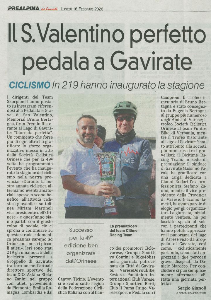 Una giornata spettacolare con temperature primaverili ha permesso ad organizzatori e partecipanti (c.ca 220) di gustarsi al meglio una domenica di sport e svago in compagnia; come sempre ottima l’organizzazione di Ciclovarese con Sergio Gianoli al timone di comando e Miriam Martinoli co-regista, panoramica e comoda la nuova logistica sul lago a Groppello di Gavirate, sorprendente e piacevole il percorso innovato al 90% che ha impegnato seriamente noi pedalatori e molto apprezzato l’ottimo banchetto con ricco pasta party e focacce veramente buone (appena “sfornate”) preparate (e ben curate) dal Ristorante-Pizzeria “Al Lago” che ha ospitato la manifestazione, complimenti anche a loro. Noi per la nostra “prima di campionato Team” abbiamo fatto gruppo in partenza e poi “sottogruppi” divertendoci tutti e “portando a cassa” il trofeo per il Team Gravel più numeroso… Grazie a tutti i presenti ed anche a chi avrebbe voluto esserci ma non ha potuto.
